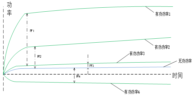 負載設備用電功率不變,隨著分布式光伏發(fā)電系統(tǒng)發(fā)電功率的逐步上升,同時電網(wǎng)側(cè)進線柜的有功功率會逐步下降,甚至出現(xiàn)分布式光伏發(fā)電系統(tǒng)倒送有功功率上電網(wǎng)的情況,所以在此情況下,不同階段的電網(wǎng)進線柜功率因數(shù)(PF1>PF2>PF3>PF4)越來越小。