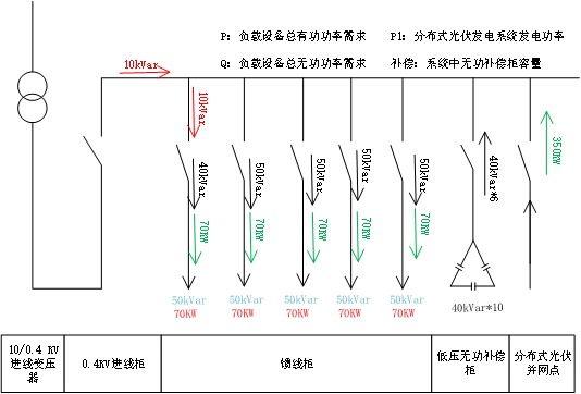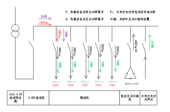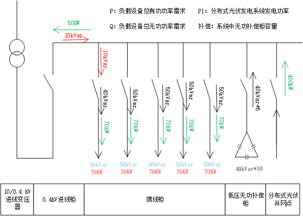 當設備運行時,則在市電進線柜,光伏發(fā)電系統(tǒng)反向倒送有功功率50KW,用電負載由市電提供無功功率,無功功率經(jīng)過補償柜補償后,市電提供無功功率10kVar,