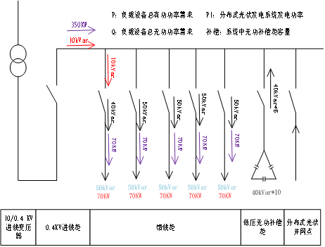 負載設備所需有功功率由(分布式光伏發(fā)電系統(tǒng)電源+電網(wǎng)電源)組成,負載設備所需無功功率由系統(tǒng)中無功補償柜子補償一部分,同時電網(wǎng)提供部分無功功率。